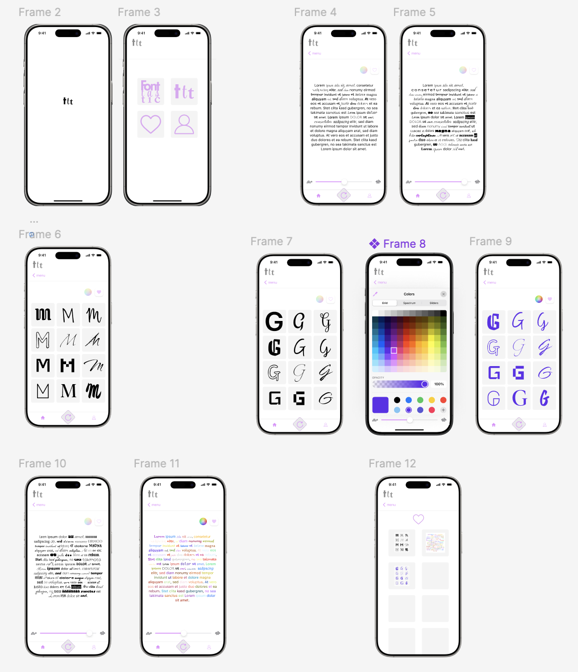 Die App ermöglicht es, einzelne Buchstaben oder Textblöcke in verschiedenen Schriftarten darzustellen, gezielt zu mischen und mit Farbe zu versehen. Ziel war eine intuitive Oberfläche, die nicht von der Typografie ablenkt. Der Fokus des Projekts lag auf UI-Design, visueller Klarheit und der Frage, wie typografische Werkzeuge als kreative Spielwiese funktionieren können.